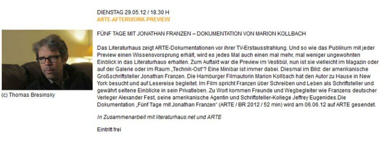 Der Film geht auf die Suche nach dem Geheimnis des grandiosen Erfolgs des Literaturstars Jonathan Franzen. Er zeigt ihn in seinem Studio in New York, wo er über 10 Jahre an dem weltweiten Bestseller „Freiheit“ geschrieben hat. Der Zuschauer erlebt Franzen in seinem Alltag während einer Promotion Tour in Denver, Los Angeles und Sacramento sowie in der Wildnis, zwei Stunden von Los Angeles entfernt, wo er in der Morgendämmerung vor dem abendlichen Live-Auftritt in einer TV-Show Vögel beobachtet. Sein deutscher Verleger, seine amerikanische Agentin und Freunde des Literaturstars sprechen über ihre Beziehung zu dem Weltautor und dessen Millionenauflagen auf dem internationalen Buchmarkt.